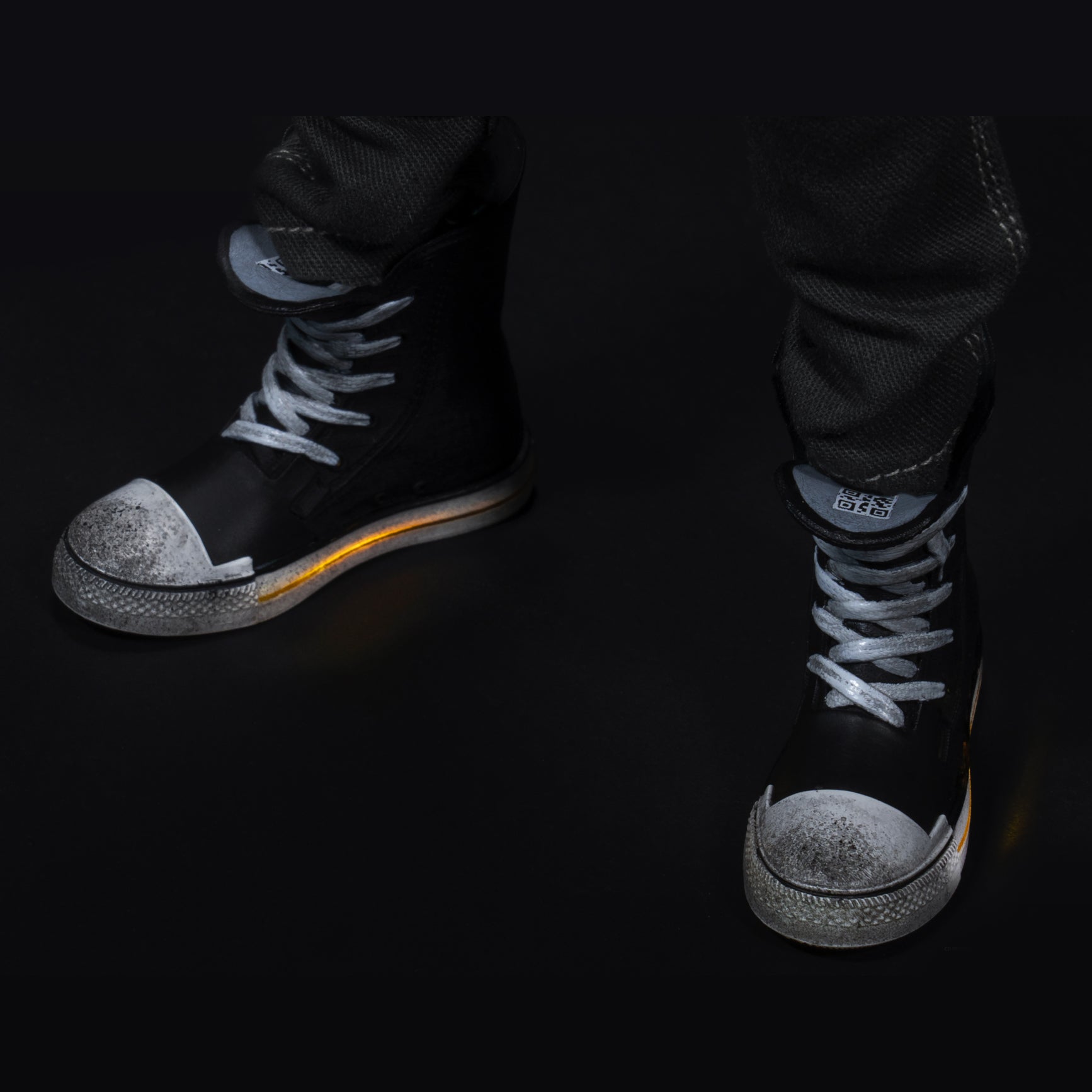 High-top black textile sneakers with orange lights on the outsole